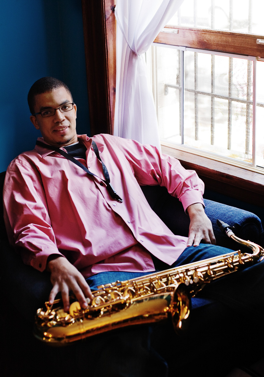 I love the contrast between the dark wall and his pink shirt... that is an awesome color on Vasco too. Light from the window and the sax just totally make it an awesome photo. Great work, Bill :)
