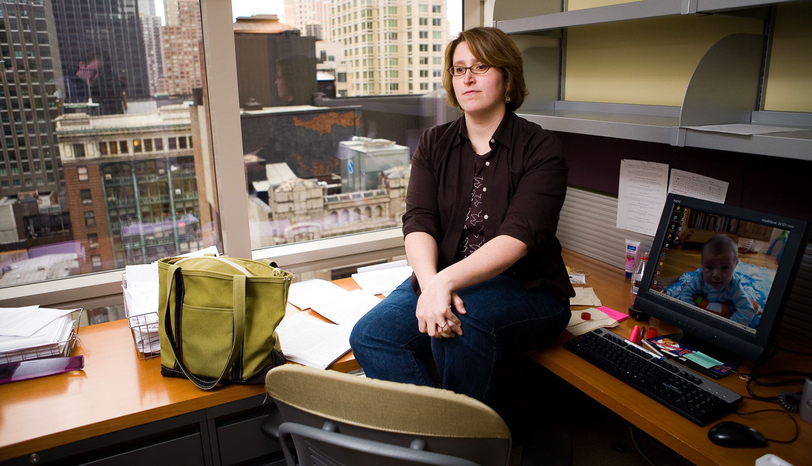 seeing. - jo I've really enjoyed all the pics so far but for some reason this one really grabbed me... her hands, the expression on her face, where she's seated, the city through the window, the baby pic on the monitor - seems like there's a lot of drama going on (whether there really is or not!)