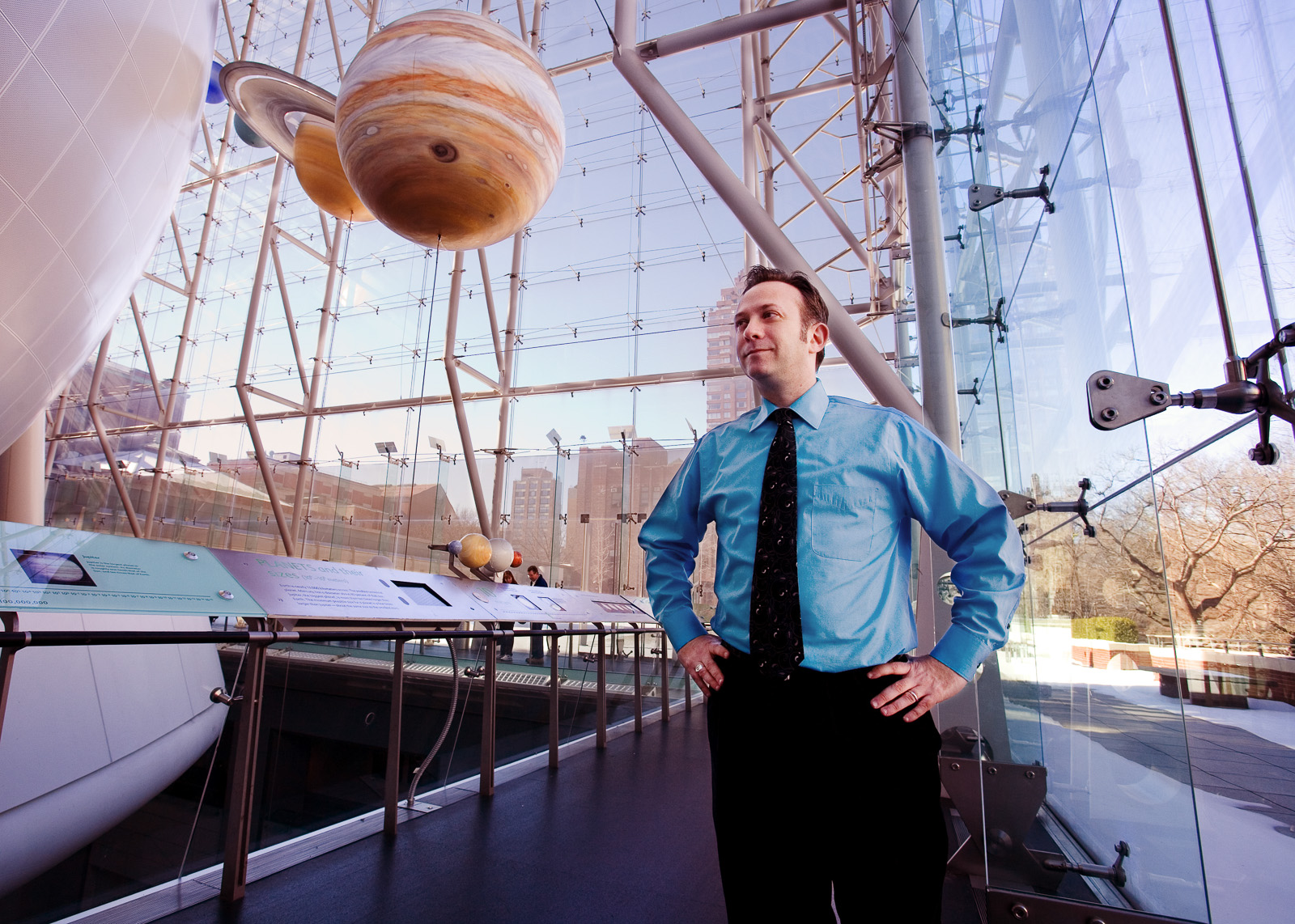 I like the way his clothing is the color of the building, but his face and hair match the planets hanging above. I think it makes him look like his thoughts and ideas rise above normal standards, just like the planets rise above the earth.