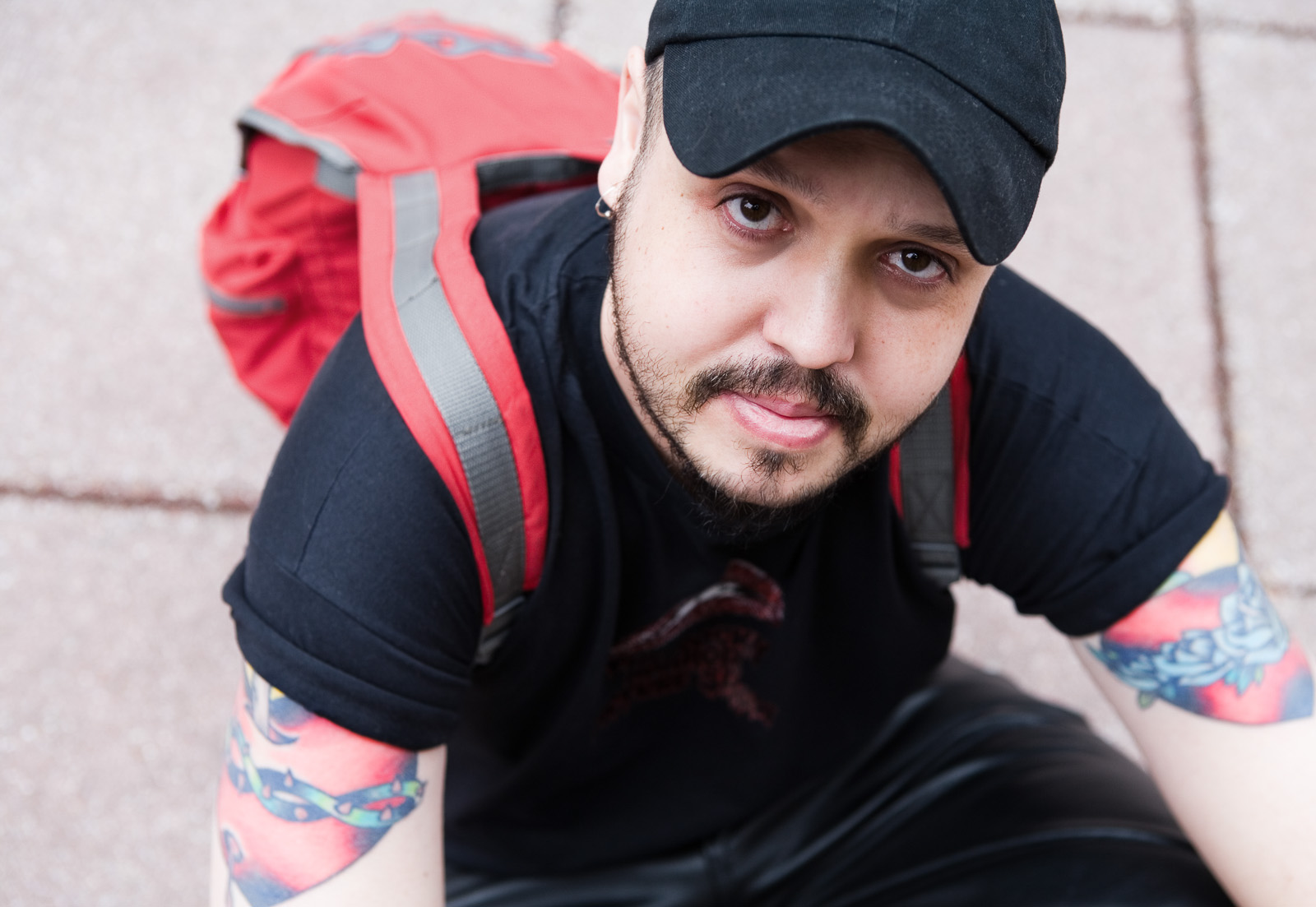 The colors of his tattoos and his backpack work well together. I also like the framing of the bill of his cap, the way it mirrors the lower half of his face and chin. - Ritchell I generally enjoy the soft look on a guys face whos tattoos seem to imply something tough and ruged. - Josh Rothhaas - definitions.wordpress.com I saw this one and went to think about it. I could remember his face so precisely. Thoughtful and serious, like a professor, kind but still holding one accountable. The other images around seemed like the symbols of growth on a tarot card and much larger in memory. No memory of the sidewalk remained, just his examining face. Beauty. - Boo - http://www.xanga.com/Boowasborn His dark eyes and bearded, oval face evoke images of portraits of the Conquistadors. I get a sense of ancient lineage. I loved what Boo had to say. And I agree.His character is so beautifully conveyed. He is indeed strong yet vulnerable,but no ones fool. the kindness in that face is overwhelming.