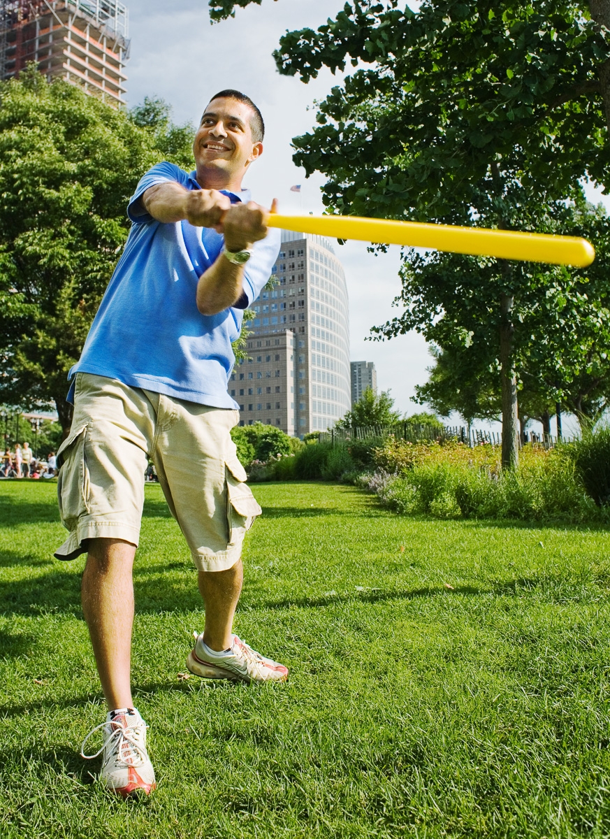 snowwhiterockhard - samsplanet I like the angle at which you took this. Love all the background colors and contrasts, Shimmy's pose, and the dynamic that it brings to the photo... but, something feels wrong about it too...can't really put my finger on it, I wish he was standing straight using the bat as a cane? I am curious what that would look like. - Ela For such an action shot, it looks a little static. Was it posed? - Jackomo To all those wondering.. yes it's an actual shot of him actually swinging.. it's not a static pose. - Bill Wadman - www.billwadman.com I like this photo just the way it is. - JA The different reactions are really interesting. I'm a big fan of this shot: the composition radiates summer in the city (the buildings, the grass & tress, the sunshine) & the subject is smiling, caught in this disarmingly childlike activity (wiffleball!). It's a photo that makes this 35-year old feel like going to the park, taking off his shoes & playing a game of tag. - nuno My sore back would agree with Bill. I took at least 75 swings with that bat using my best golf skills to keep my head in one place while Bill found the shot. - Shimmy - http://www.angelwish.org/wiffleball I love it! One of my favorites!! - Amber - http://www.sleepyheadcity.com/awake/blog/ yeah, i love it too! makes me think of exactly how i would feel on a day like that in the park playing wiffle ball.
