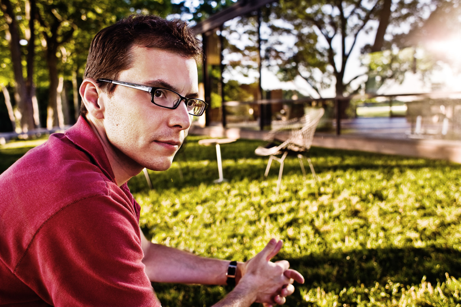 yay! another solid shot. I like how serious he is. The light at the right is interesting...do not know if it was intentional or not - Carlos Urreta - http://www.fortstreetpulse.com i like the colouring in this one very much. and i don't care if it's photoshoped or not. but something in his expression makes me think that he's not all that serious... - samsplanet very striking, very gorgeous photograph... almost looks like it's HDR. I like the forearms and hands being out of focus, too. slightly wacky, that ;-). - andrea - www.andreamann.com I like the position of his hands -- they look like he's training a pistol, protecting his landscape. Fun pic. - Spamboy - http://www.spamboy.com/ Eh, you know I like all of your through-the-glasses photos... with this one you proved why. Colors are amazing! What is that glass house? - Ela Jakiela - www.photo.net/photos/***ELA*** looks like a scene from a movie,i like - WOW, I looked at it again and only now I noticed the glow on the far right... This photo is surprising, fresh and really really good, Bill! - Ela Jakiela - www.photo.net/photos/***ELA*** There are men you have photographed who appear to have a child inside but this one is different. He has an age in there it seems. By no means is it lacking energy but for the world as if he is already bearded and hoary haired and still determined as ever. - Boo - http://www.xanga.com/Boowasborn Oh this portrait is lovely and he is certainly lovely as well!