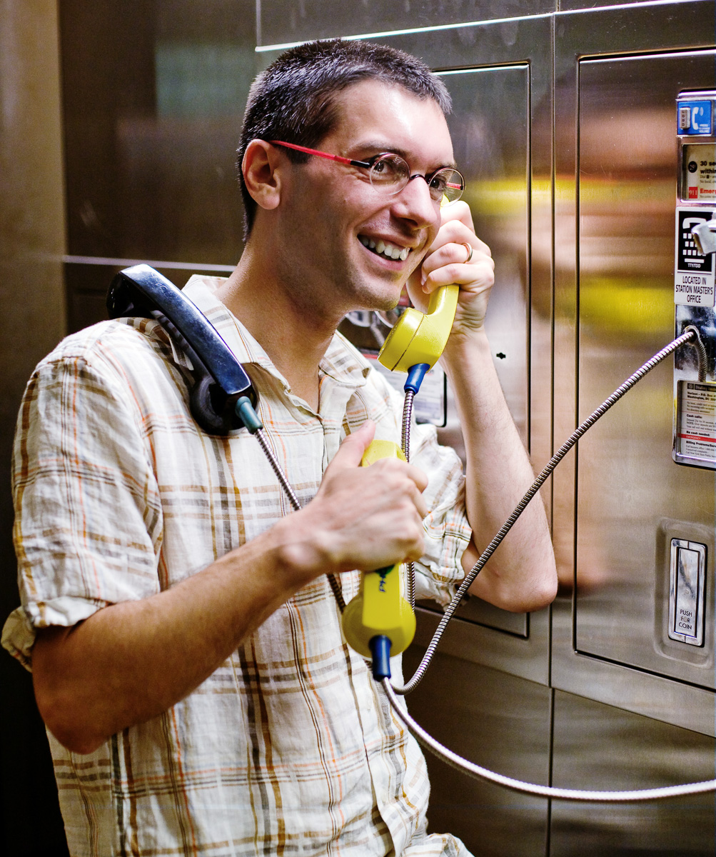 Great picture!! Near the top of favorites. The colors are pleasing; the reflections add interest and he looks as if he's laughing at the whole situation. Surely you captured his personality well. - Iris Fantastic. - carpeicthus WOW, love it. Tristan is obviously a very fun and funny guy and you captured that perfectly. LOVE the colors, too. - Amy very nice, and really quite silly. which, as we both know, can only be a good thing. - andrea - www.andreamann.com Google this guy and you will find he sure has done something! What a coup to get such a shot of a true innovator. Bravo. - buckycatt It's as if he's aggregating the telephone lines like an RSS feed - Spamboy - http://www.spamboy.com/ Very fun. Love the composition on this one. - AL Awesome idea! Great smile, and as always ligting and colors!!! Bill, this is just FUN! - Ela That's Tristan, allright. :) Nice shot. - Peter - www.prdifferently.com