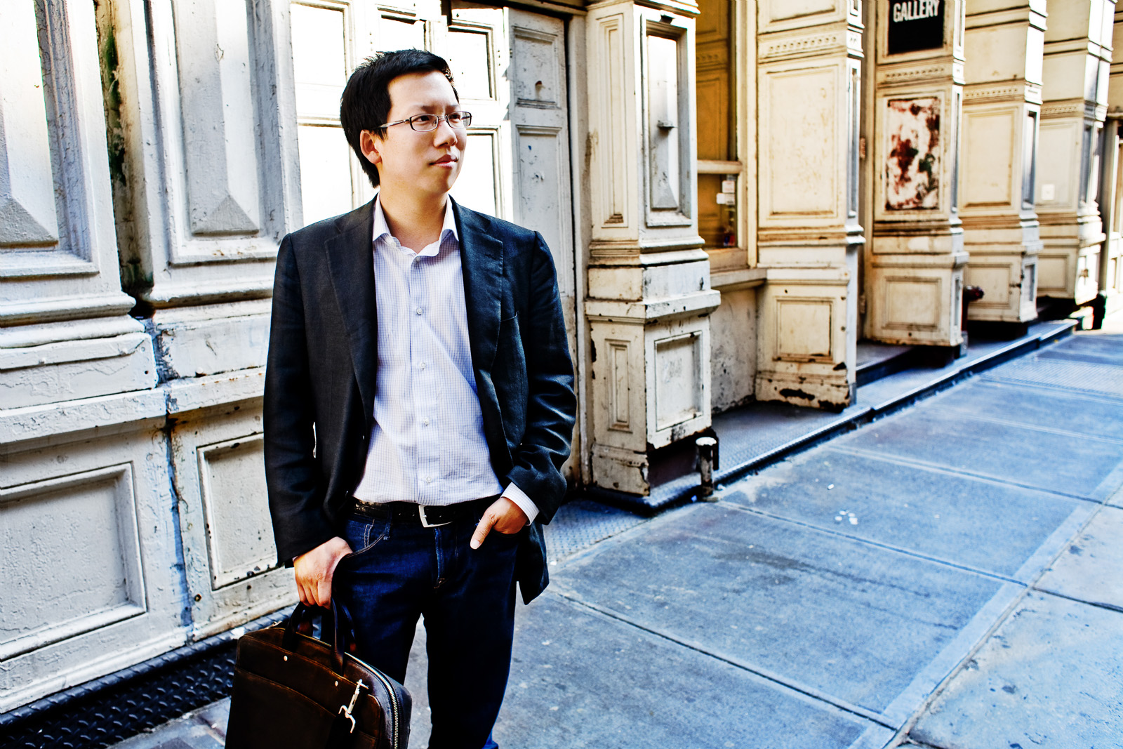 Interesting choice -- Soho itself takes on equal importance in this portrait, given the abundance of repeating columns in the background. It's also striking that he's looking off to the right, into the distance, as the viewer's eye is drawn in the same direction but backwards (down the street) -- it makes a neat visual "right angle" of sorts.