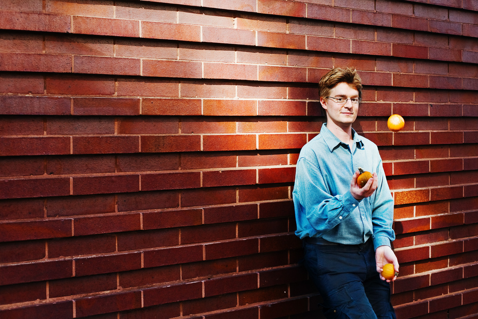That's talent! Great pic! - Danny - http://www.eldanny.com so very, very cool. yet witty & warm. - story - prettylittlemess.wordpress.com It almost looks like the pumpkins are orbs of light shining on the wall...the very interesting brick wall. - Jocelyn - http://www.myspace.com/jocelynryder That streak of light going across the bricks is a real nice touch. - Mikey The juggling is usually easy while maintaining eye contact, but looking off to the side made it much harder. Luckily those pumpkins (an awesome find by my wife at the green market in union square) were forgiving of a few drops.