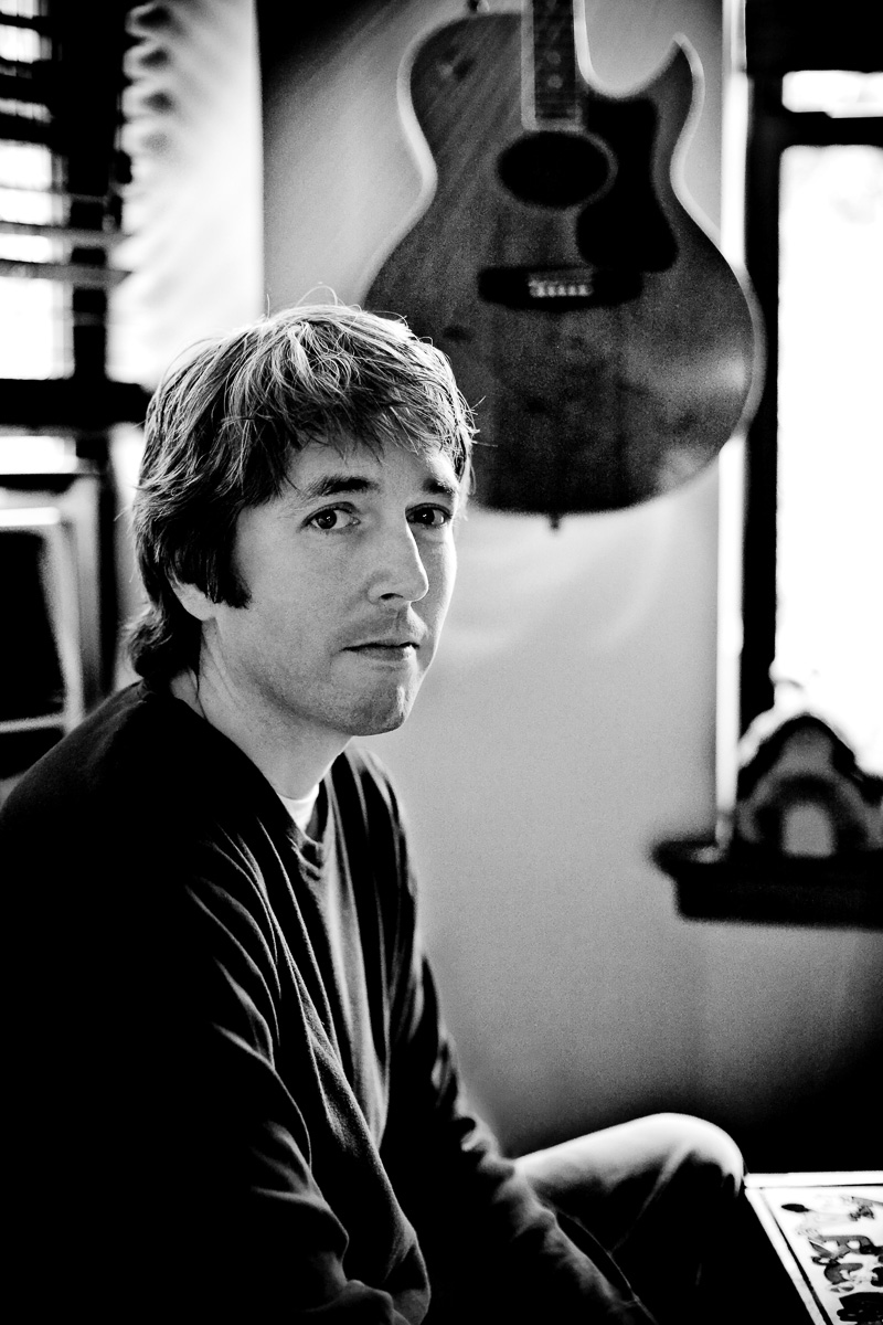 You know what is cool about this photo... the fact that Mark doesn't seem to look straight into the lens but somewhere really close to it. It makes the photo seem more natural, and not posed. I love the guitar. B/W always wins :)
