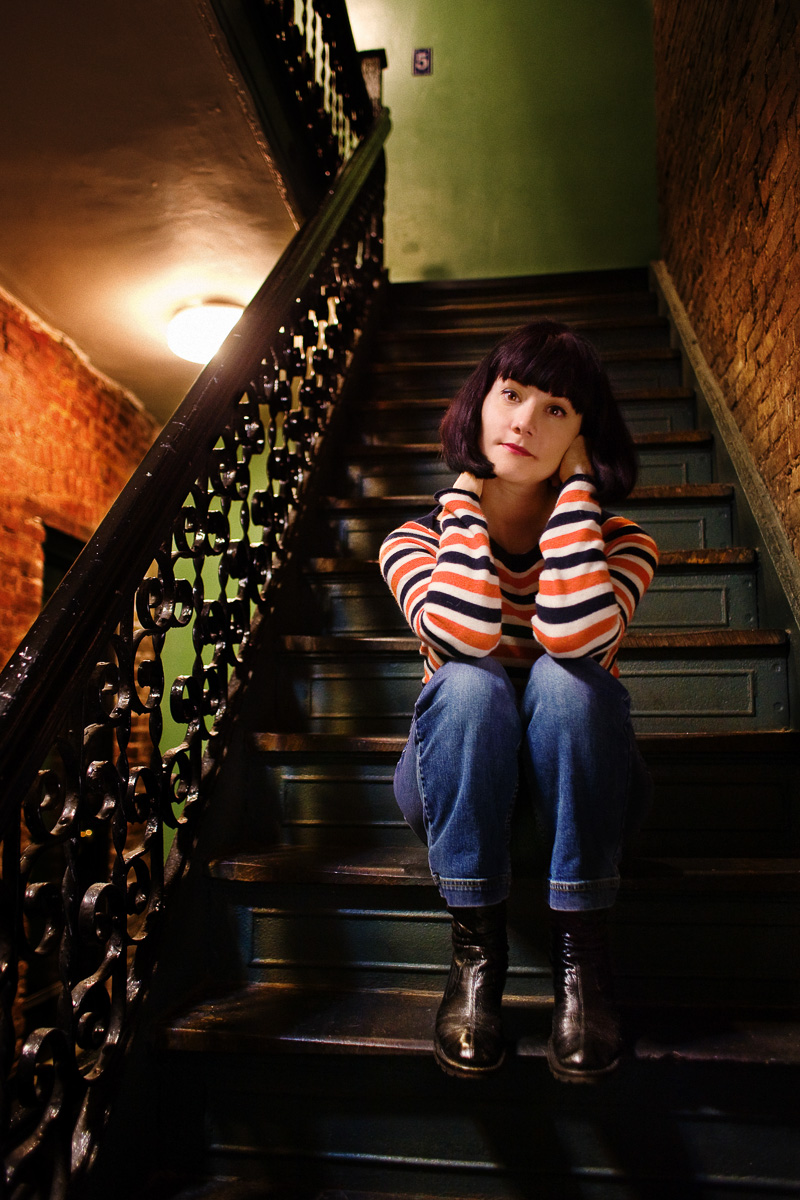 I like all the different textures and colors and lines. The design of the swirly handrail metal work is very neat and an unexpected detail for such a dim location. Its also not bad that you put a lovely ladyin the shot. :) Curious - what was the lighting setup? Did you stick with available light only? *** It's lit by two fluorescent ceiling bulbs, one in the back like you see and one above to her right. Just that and a reflector in my right hand to fill her face a little. So yes, available light in this one. -bw<br /><br /><i>Edited By Siteowner</i>
